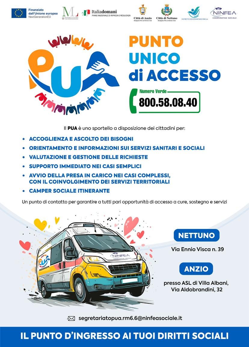 Il Segretariato Sociale - PUA (Punto Unico di Accesso) è uno sportello a cui possono rivolgersi tutti i cittadini per essere informati sui servizi e sulle prestazioni sociali, sanitarie e socio-sanitarie presenti nel territorio distrettuale dei Comuni di Anzio e Nettuno (ad esempio, è possibile richiedere informazioni sui contributi economici, sull'assistenza domiciliare integrata e sul CAD - Centro Assistenza Domiciliare per le prestazioni sanitarie, ecc.).